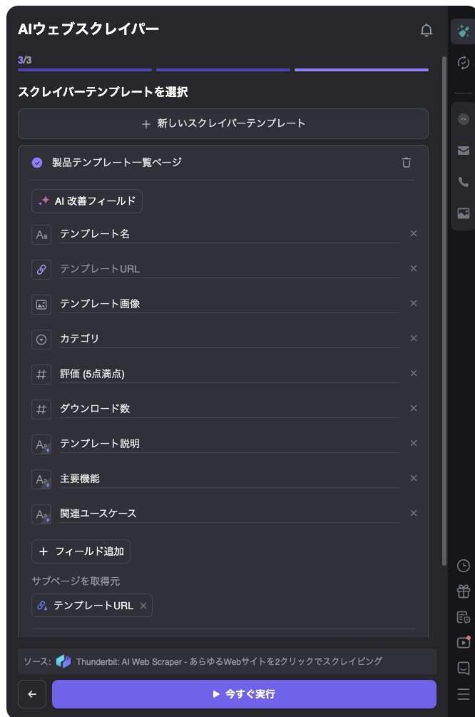 第3世代が「AI×ノーコード型」。LLM(大規模言語モデル:ChatGPTやClaudeのような高度なAI)を組み込み、ページ構造をAIが自動で読み解いて列名まで提案してくれる仕組みです。Thunderbitに代表される最新世代で、設定らしい設定が不要なため、本当の意味でのノーコード体験を実現しています。