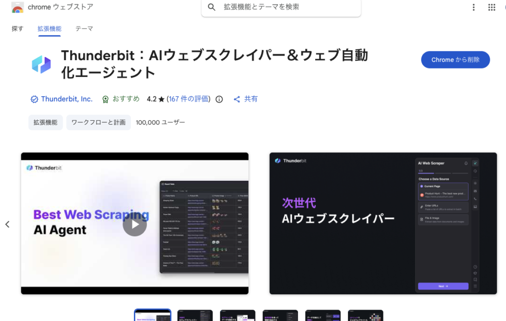 Chromeウェブストアで「Thunderbit」を検索し、拡張機能をインストールします。